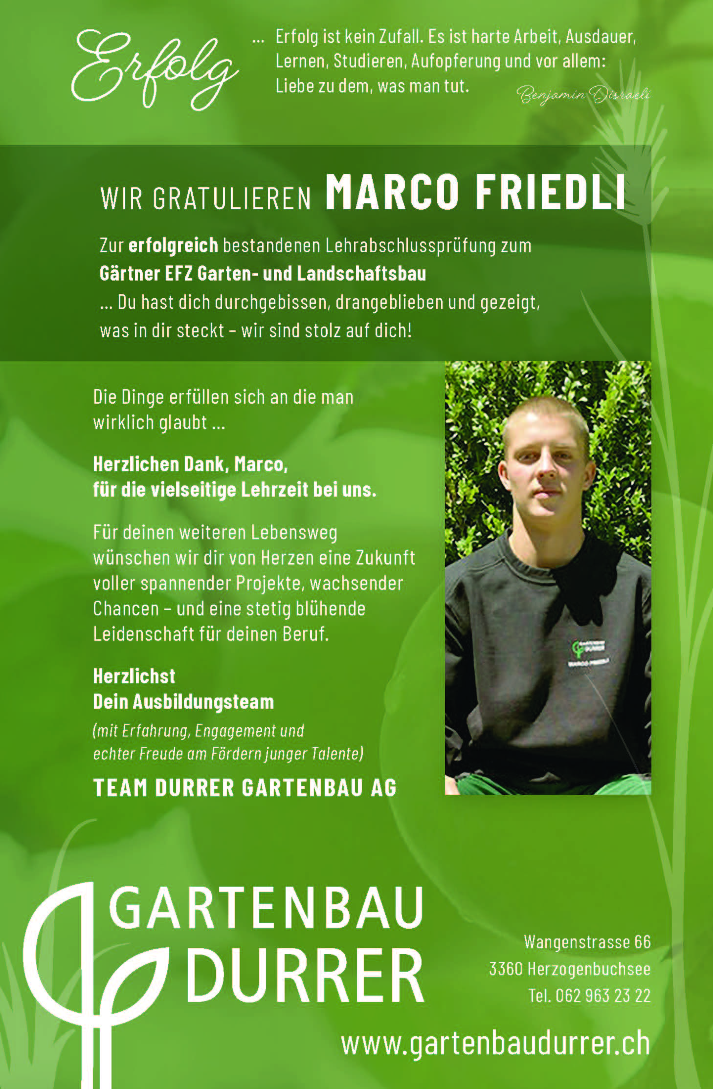 Zur erfolgreich bestandenen Lehrabschlussprüfung zum Gärtner EFZ Garten- und Landschaftsbau